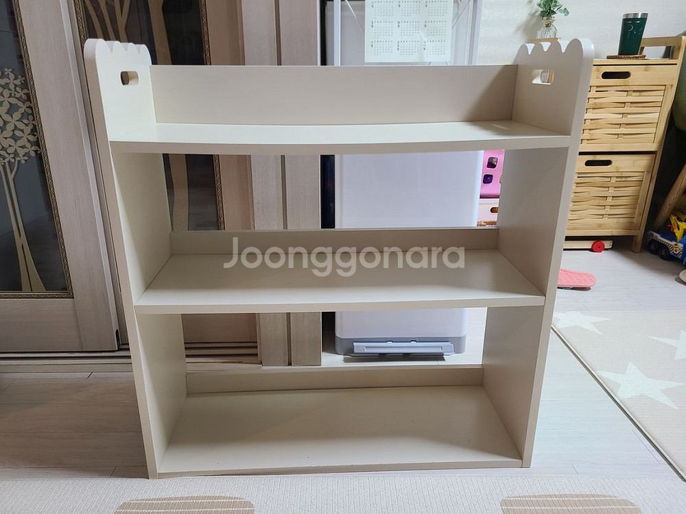 블루래빗 3단책장이에요. 이 책장 특성인데 첨부터 곳곳에 페인트긁힌 자국같은 게 있었어요. 그리고 창가앞에두었더니 색이 원래 아이보리인데 맨 뒷면 윗쪽이랑 측면쪽이 바래서 백색으로 조금 변했는데 그렇게 신경쓰일정도는 아니에요. 은근 책이 많이 들어가고 그외에는 상태좋아요:) 가로66 세로23 높이70