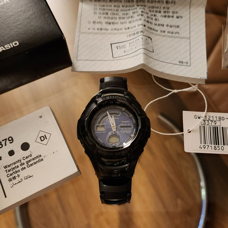쥐샥(G-SHOCK) GW-1211BD-1AVDR 신동급 풀박스입니다. 2006년 8월 서울 신라면세점에서 36만원에 구입했고, 상태는 매우 깨끗하고 잘 작동합니다. 반영구 태양전지 방식으로 배터리 교체가 필요없으며, 자세한 스펙 정보는 아래 참고하시기 바랍니다. [ G-SHOCK / GW-1211BD-1AVDR / 3379 ] LED light(Full auto light super illuminator) 시계를 기울이면 표시면에 불이 들어오는 auto light기능이 어두운 곳에서는 자동적으로 ON이 되며 밝은 곳으로 가면 자동적으로 OFF가 된다. //태양전지 사용//30개국의 주요도시 시간 표시//스톱워치는 그림에 나와 있는 숫자(1/100)는 1/100초단위로 측정한다는 뜻. 밑에 있는 숫자는 측정할 수 있는 최대 시간.(100MIN은 100분) //60분 타이머 동작(반복 기능)//설정한 시간이 되면 알람이 울린다. 5건의 알람 건수를 표시한다. 시보는 매 정시에 울린다. //현재의 밧데리 용량을 표시한다.//월말의 날짜수정이 전혀 필요 없다.//시간표시는 12시간제 표시와 24시간제 표시 둘중 하나를 선택 가능.//충격과 진동에 강한 내충격구조//20기압방수//단시간에 광선을 흡수해서 장시간 어두운 데에서 볼 수 있는 야광도료를 사용//충격에 강한 유리를 사용. ※ 이 마크가 없는 시계는 아크릴 등을 사용 //스테인레스 Solid 밴드//원터치 접이식 버클k
