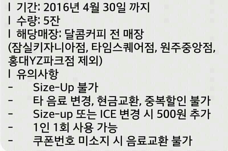 달콤커피 아메리카노 5잔 일괄 10000원 1잔구매시 2500원 사진에 있는 주의사항 꼭 읽어보고 구매해주세요. 1인1매 사용가능. 입금후 쿠폰번호 전송. 에눌사절