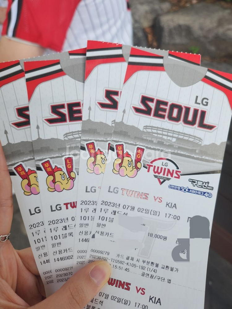 사정이 생겨 급처 합니다 1루 레드석 101구역 8열 4연석 정가보다 싸게 양도합니다 장당 15,000씩이고 하나씩 구매도 가능해요 지류티켓이라 줄서지않고 바로 입장가능해요 종합운동장역에서 바로 양도해드려요!