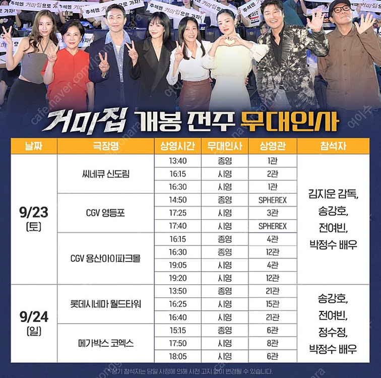 ※ 카페 상품 게시글은 자동으로 중고나라 앱/사이트에 노출합니다. 노출을 원하지 않으실 경우 고객센터로 문의 바랍니다. ※ 등록한 게시글이 회원의 신고를 받거나 이상거래로 모니터링 될 경우 중고나라 사기통합조회 DB로 수집/활용될 수 있습니다. ─────────────────── 📢 제목에 "제조사/ 브랜드 명"과 "티켓명(ex. 스타벅스 아메리카노 Tall) ”을 넣어 작성하면, 보다 빠른 판매가 가능합니다! 📢 게시글 작성 시 배송 방법에 “직거래”와 “내 위치” 설정할 경우, 보다 빠른 판매가 가능합니다! 영화 거미집 개봉 전주 9월30일(토) 무대인사 용산 CGV 16:15 종영시 4관 A열 중블 - 1 자리 : 25000원 직거래❌ , 떠보기 ❌