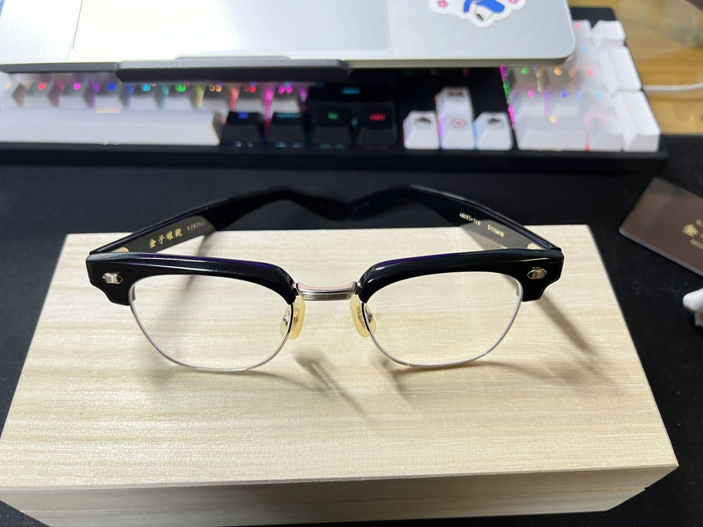 금자안경 kv-94 작년 초쯤 샀습니다. 사고 착용했을때 저와 잘 안어울리고 제 기준에 무겁다는 느낌이 있어서 잘 착용을 안하게되어 팔게되었습니다. 보증서, 안경케이스, 나무박스 모두 갖이고 있습니다.