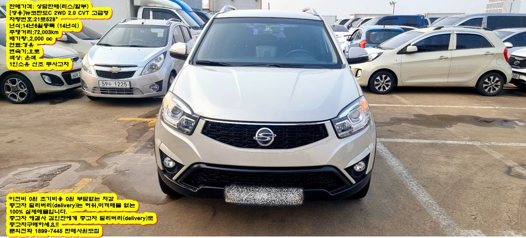 신차와 같은 중고차 [쌍용]뉴코란도C 2WD 2.0 CVT 고급형 초기비용 0원 이전비 0원 대기없이 다이렉트 즉시당일출고 여유자금까지 보너스로 지급 최고급(수입차,국산차) 중고차 부담없이 구매도와드립니다. (개인회생,개인파산,신용불량이신분도 상담후 진행가능) 이전비 0원, 차값+자동차보험료+여유자금까지 무보증 최장60개월분할납입가능 좋은차 이전비 전혀 부담하지마시고 차가격만 매월 저렴하게 납입하시고 3년만 타시다가 직거래로 판매하시면 큰 손해 안나게 도와드립니다! (개인회생,개인파산,신용불량인 분들도 상담후 진행 가능합니다.)중고차리스,중고차매매,중고차할부, 중고차거래, 폐차상담,신차상담, 자동차보험상담 판매가격: 상담판매(리스/할부) [쌍용]뉴코란도C 2WD 2.0 CVT 고급형 차량번호:21로528* 년식;14년6월등록 (14년식) 주행거리;72,003km 배기량:,2,000 cc 연료:경유 변속기;오토 색상: 은색 1인소유 신조 무사고차(590만원) 2014년식 2014년등록 오토 은색 1인소유 신조 무사고 차량입니다. 압축도어,가죽씨트,열선씨트,통풍씨트,ABS,듀얼에어백,TCS,자동접이식 사이드미러,샤크안테나, 전,후방감지기,CDP,풀오토전자동에어컨,가죽핸들,크루즈컨트롤,스마트키,스타트버튼키,네비게이션,GPS,DMB,후방카메라,알루미늄휠,스마트키,등이 장착된 풀 옵션 (장착옵션 계약시 확인필!!) 미세오일누유조차 없이 최고의 컨디션을 유지하고 있는 주행거리 짧은 특A급 차량입니다.지금 결정하시고 바로 전화 주시면 이 가격, 단 한번 파격 조건으로 가능합니다.빨리 전화 주시고 예약하셔야만 내 마음에 쏙 드는 좋은 중고차 주인이 될 수 있도록 도와드립니다~~~ 중고차 딜리버리(delivery)는 허위,미끼매물 없는 100% 실제매물입니다. 중고차 해결사 김인찬에게 중고차 딜리버리(delivery)로 중고차구매하세요!! 문의전화 1899-7445 판매사원모집010-9948-5300