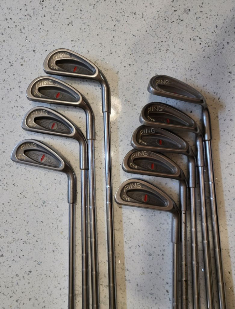 레어템 PING EYE 아이언 세트! 아이언은 3~9번, W~S웨지를 포함한 9아이언입니다. 클래식 아이언은 그립상태가 중요한데, 로얄그립 상태 양호합니다. PING EYE 아이언으로 클래식 골프의 재미를 즐겨보세요.