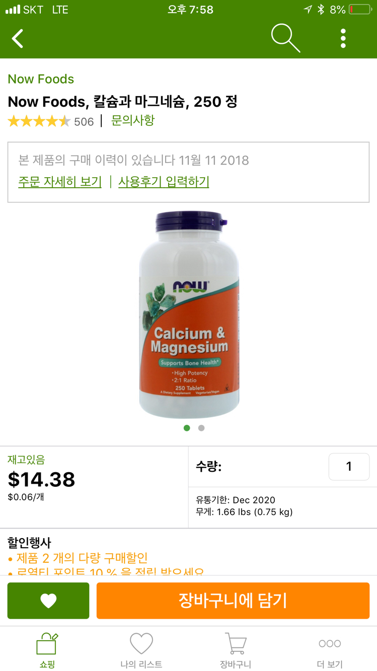 나우푸드 칼슘&마그네슘 250정 (now - calcium & magnesium) - 미개봉새상품 - 유효기한 사진첨부 동일상품을 실수로 2개 주문하여 1개 판매합니다. 저는 아이허브에서 직구로 주문했구요. 여느 인터넷가보다 저렴하게 내놓아요. 필요하신분은 1:1채팅이나 댓글 남겨주세요:-)