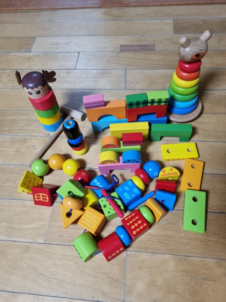 오뚜기 링 끼기, 망치치기, 실꿰기, 탑쌓기 입니다. 모두 원목이고 깨끗해요.