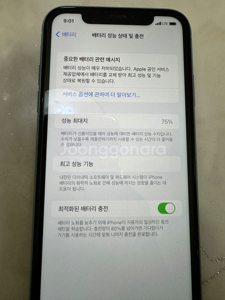 아이폰11 256GB 무음 카메라 해외버전(북미) 세컨폰 목적으로 중고로 구매후 거의 사용하지않아 판매합니다 배터리 성능 75% 구매후 그대로이며 테두리 및 카메라 기스 및 찍힘 등 있습니다 이미지 그대로 본품, 박스, 케이스 미사용 케이스도 있으며 필름은 찾지를 못해서 이대로 판매합니다 ㅜㅜ 중고 특성상 교환 환불 받지 않으며 안전결제 가능합니다