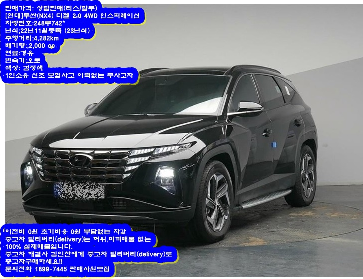 신차와 같은 중고차 [현대]투싼(NX4) 디젤 2.0 4WD 인스퍼레이션 주인을 찾습니다. 초기비용 0원 이전비 0원 대기없이 다이렉트 즉시당일출고 여유자금까지 보너스로 지급 최고급(수입차,국산차) 중고차 부담없이 구매도와드립니다. (개인회생,개인파산,신용불량이신분도 상담후 진행가능) 이전비 0원, 차값+자동차보험료+여유자금까지 무보증 최장60개월분할납입가능 좋은차 이전비 전혀 부담하지마시고 차가격만 매월 저렴하게 납입하시고 3년만 타시다가 직거래로 판매하시면 큰 손해 안나게 도와드립니다! (개인회생,개인파산,신용불량인 분들도 상담후 진행 가능합니다.)중고차리스,중고차매매,중고차할부, 중고차거래, 폐차상담,신차상담, 자동차보험상담 판매가격: 상담판매(리스/할부) [현대]투싼(NX4) 디젤 2.0 4WD 인스퍼레이션 차량번호:248루742* 년식;22년11월등록 (23년식) 주행거리;4,282km 배기량:,2,000 cc 연료:경유 변속기;오토 색상: 검정색 1인소유 신조 보험사고 이력없는 무사고차 (4690만원) 2023년식 2022년등록 오토 검정색 1인소유 신조 보험사고 이력없는 무사고 차량입니다. 압축도어,가죽씨트,열선씨트,통풍씨트,전동씨트,메모리씨트,ABS,커튼에어백,TCS,자동접이식 사이드미러,샤크안테나, 전,후방감지기,최고급 2채널 차량용 블랙박스,CDP,풀오토전자동에어컨,가죽핸들,히팅핸들,크루즈컨트롤,스마트키,스타트버튼키,네비게이션,GPS,DMB,후방카메라,ECM룸미러,하이패스,차선이탈경보기,알루미늄휠,스마트키,차선이탈경보기,파노라마 전동썬루프,어라운드뷰,파워트렁크,등이 장착된 풀 옵션 (장착옵션 계약시 확인필!!) 미세오일누유조차 없이 최고의 컨디션을 유지하고 있는 주행거리 짧은 특A급 차량입니다.지금 결정하시고 바로 전화 주시면 이 가격, 단 한번 파격 조건으로 가능합니다.빨리 전화 주시고 예약하셔야만 내 마음에 쏙 드는 좋은 중고차 주인이 될 수 있도록 도와드립니다~~~ 중고차 딜리버리(delivery)는 허위,미끼매물 없