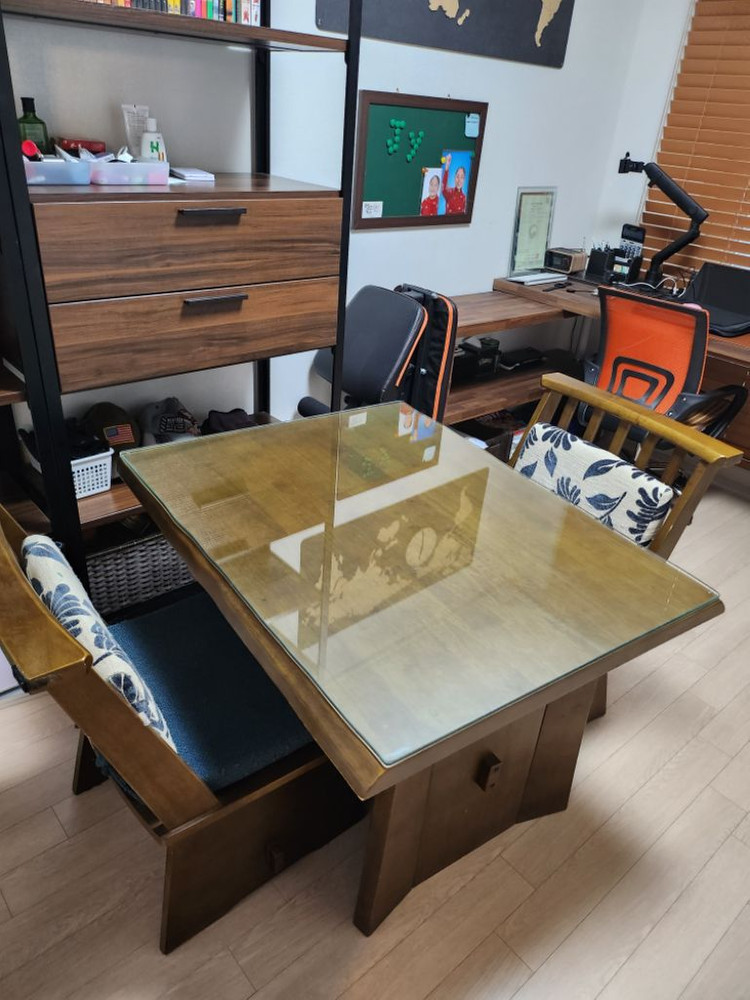 2인용탁자입니다 좋은원목으로 구매했을때110만원에 구매 위에 두꺼운유리는 저희가따로맞췄습니다 같이드려요 의자두개있어요 색이 고급스럽습니다 가로100 세로77 높이 63