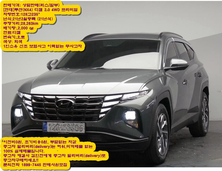 신차와 같은 중고차 [현대]투싼(NX4) 디젤 2.0 4WD 프리미엄 초기비용 0원 이전비 0원 대기없이 다이렉트 즉시당일출고 여유자금까지 보너스로 지급 최고급(수입차,국산차) 중고차 부담없이 구매도와드립니다. (개인회생,개인파산,신용불량이신분도 상담후 진행가능) 이전비 0원, 차값+자동차보험료+여유자금까지 무보증 최장60개월분할납입가능 좋은차 이전비 전혀 부담하지마시고 차가격만 매월 저렴하게 납입하시고 3년만 타시다가 직거래로 판매하시면 큰 손해 안나게 도와드립니다! (개인회생,개인파산,신용불량인 분들도 상담후 진행 가능합니다.)중고차리스,중고차매매,중고차할부, 중고차거래, 폐차상담,신차상담, 자동차보험상담 판매가격: 상담판매(리스/할부) [현대]투싼(NX4) 디젤 2.0 4WD 프리미엄 차량번호:128고235* 년식;21년2월등록 (21년식) 주행거리;28,263km 배기량:,2,000 cc 연료:디젤 변속기;오토 색상: 회색 1인소유 신조 보험사고 이력없는 무사고차(3390만원) 2021년식 2021년등록 오토 회색 1인소유 신조 보험사고 이력없는 무사고 차량입니다. 압축도어,가죽씨트,열선씨트,통풍씨트,ABS,커튼에어백,TCS,자동접이식 사이드미러,샤크안테나, 전,후방감지기,최고급 2채널 차량용 블랙박스,CDP,풀오토전자동에어컨,가죽핸들,히팅핸들,크루즈컨트롤,스마트키,스타트버튼키,네비게이션,GPS,DMB,후방카메라,ECM룸미러,하이패스,차선이탈경보기,알루미늄휠,스마트키,차선이탈경보기,헤드업디스플레이(HUD),,등이 장착된 풀 옵션 (장착옵션 계약시 확인필!!) 미세오일누유조차 없이 최고의 컨디션을 유지하고 있는 주행거리 짧은 특A급 차량입니다.지금 결정하시고 바로 전화 주시면 이 가격, 단 한번 파격 조건으로 가능합니다.빨리 전화 주시고 예약하셔야만 내 마음에 쏙 드는 좋은 중고차 주인이 될 수 있도록 도와드립니다~~~ 중고차 딜리버리(delivery)는 허위,미끼매물 없는 100% 실제매물입니다. 중고차 해결사 김인찬에게 중고차 딜리버리