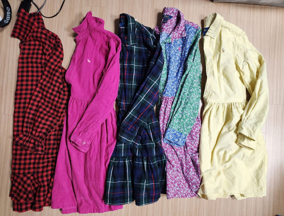 사이즈는 150-155, 14Y 입니다. 왼쪽부터 노브랜데 레드체크 블루독 골덴 원피스 폴로 도톰 체크원피스 폴로 꽃무늬 봄가을 원피스 폴로 옐로우 원피스 입니다. 중간 3벌 상태가 제일 양호합니다 몇번 안입었어요. 키 160 47키로 딸아이 작네요. 일괄 택포 입니다.