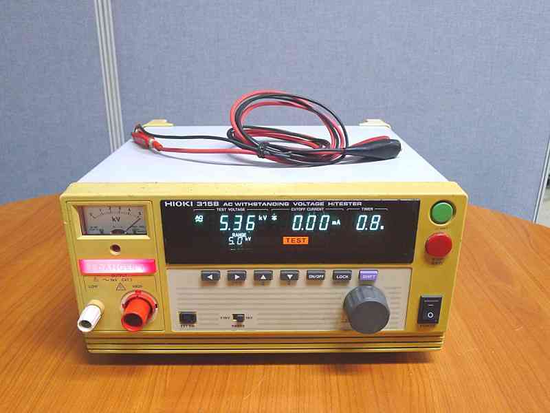 안녕하세요? Hioki 3158 내전압테스터입니다. AC 5KV. 성능,기능 정상입니다.(테스트완료)----------------->55만원 택배비 7천원 감사합니다. 010-2449-7899 시험전압 - 인가전압 : AC 0~2.5kV/0~5.0kV (평균치 정류 실효치 표시) - 파형/주파수 : 전원파형/전원동기 - 전압인가방식 : Zero 투입 Switch - TRANS용량 : 500VA (30분 정격) - 전압조정방식 : 수동설정 - DIGITAL : AC 0.00 kV ~ 5.00kV/±1.5% f.s. (JIS 1.5급 상당) - ANLOG : AC 0 ~ 5kV/±5% f.s. 전류검출부 - 전류측정범위 : 0.01mA ~ 120mA - 지시치 : 평균치 정류 실효치 표시(Digital) - 측정분해능 : 0.01mA (2/8mA Range) ~ 1mA (120mA Range) 판정기능 - 판정방식 : Window.Comparator 방식 (Digital 설정) - 판정내용 : UPPER-FAIL: 측정 전류치가 설정 상한치를 초과한 경우 PASS: 측정 전류치가 설정 상 하한치의 범위에서 설정시간을 경과한 경우 LOWER-FAIL: 측정 전류치가 설정 하한치 미만인 경우 - 표 시 : 형광 표시관 (Digital 표시) - MONITOR기능 : 출력전압.검출전류, 2회/s 이상 - TIMER설정범위 : 0.5s ~ 999s - INTERFACE : EXT I/O, EXT SW, RS-232C