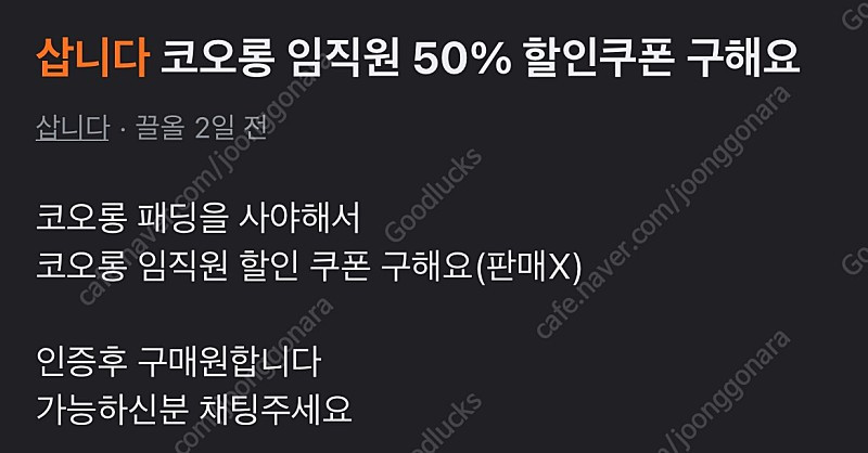 ※ 카페 상품 게시글은 자동으로 중고나라 앱/사이트에 노출합니다. 노출을 원하지 않으실 경우 고객센터로 문의 바랍니다. ※ 등록한 게시글이 회원의 신고를 받거나 이상거래로 모니터링 될 경우 중고나라 사기통합조회 DB로 수집/활용될 수 있습니다. ─────────────────── 📢 제목에 "제조사/ 브랜드 명"과 "상품명”를 넣어 작성하면, 보다 빠른 판매가 가능합니다! 📢 게시글 작성 시 배송 방법에 “직거래”와 “내 위치” 설정할 경우, 보다 빠른 판매가 가능합니다! 코오롱몰 임직원 쿠폰 삽니다 연락주세요