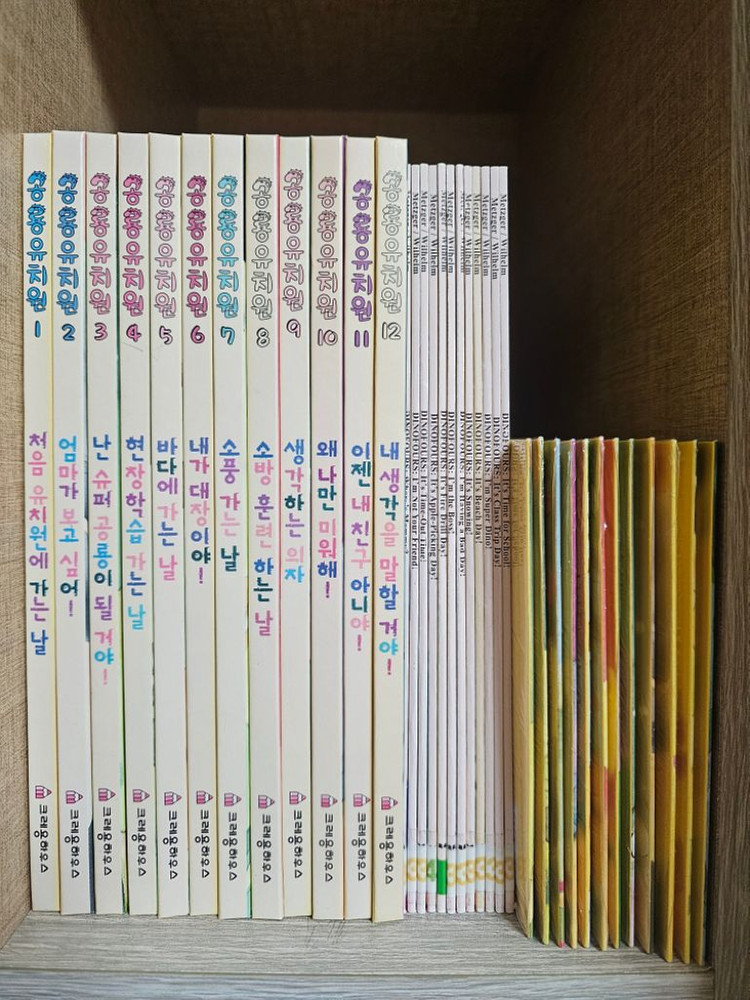 공룡유치원 한글책 12권 DINOFOURS 12권 + CD 12장 쌍둥이 책으로 보실수 있습니다. 상태 깨끗합니다. CD는 1장 제외 비닐채 입니다.