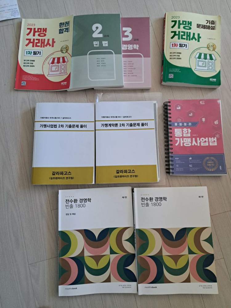 23년 가맹거래사 1차.2차교재 일괄 판매합니다. 올 3월에 시험 치려고 준비했는데 업무상 일이 너무 바빠서 도저히 공부를 할시간이 없어서 내놓습니다. 1차 한권합격책은 분권으로 작업해놨고 기출문제해설은 안에 기출질문에 관한 설명과 지문에 따른 해설등을 적어놨고 답도 표기되어 있습니다. 참고로 저는 이렇게 공부해서 인강없이 오로지 교재로만 중개사.행정사 합격한 사람이라 좀 지저분하다고 여기실찌는 모르지만 합격하기위한 지름길이라고 보셔도 되겠습니다. 1차 행정학은 따로 전수환 빈출1800으로 공부하였고 내용정리 되어 있습니다. 2차는 갈라파고스 교재로 안은 깨끗합니다 다만 가맹계약론이 떨어져 나가서 따로 분철해놓았습니다. 2차 박성진 통합가맹사업법책은 스프링제본을 해놔서 깨끗합니다. 나머지 2차 가맹사업법 법률 프린터한거와 법조문 암기에 따른 두문자정리도 함께 보내드리겠습니다. 1차 경제학 정리한것도 같이 넣어 드리겠습니다 이교재로만 인강없이 공부하셔도 충분히 합격하실꺼라 보여집니다.