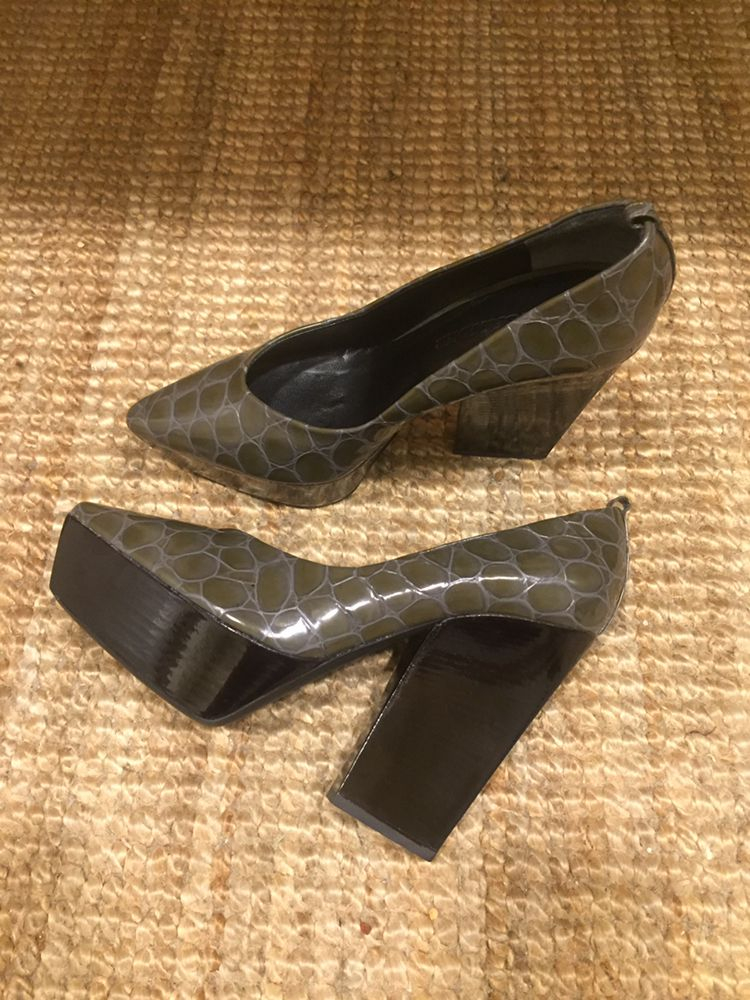 라프 시몬스가 디자인한 질 샌더의 올리브 그린 컬러 페이던트 가죽 펌프스 플랫폼입니다. 앞뒤 안정감 있는 우드 힐은 11.5cm이고, 사이즈는 36, 구입 후 시착만 한 거의 새 제품입니다. 문의 주세요.