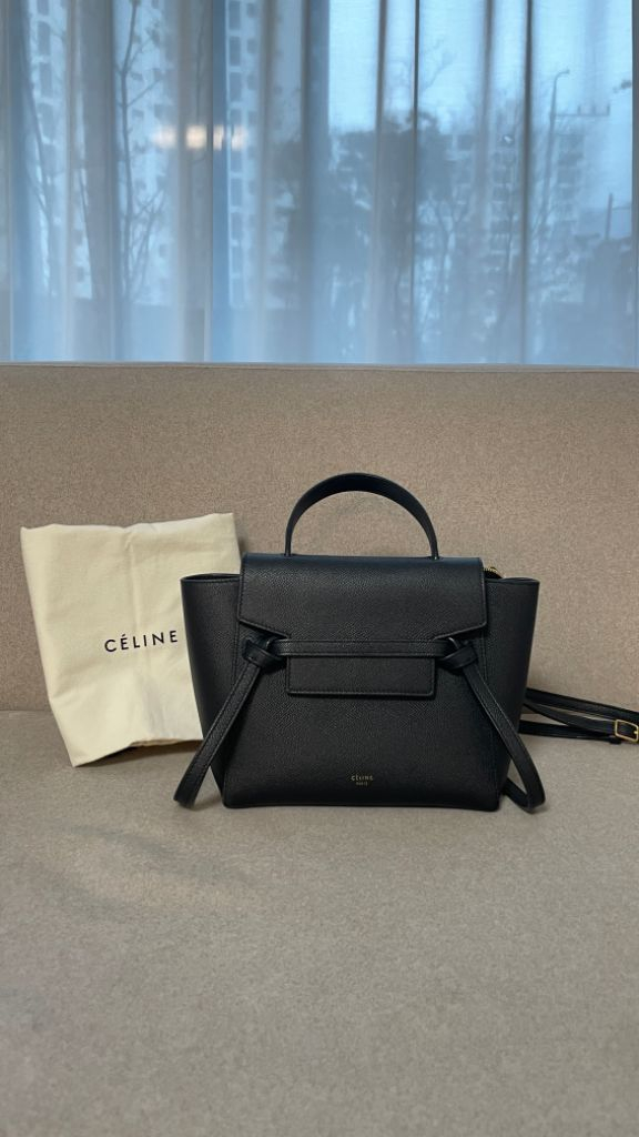 셀린느 벨트백 나노사이즈 블랙색상입니다. 2018년 남편이랑 연애시절 싱가폴 여행 시 선물받았고 더스트백, 종이가방 함께 보관중입니다. (개런티카드는 원래 없으며 박스는 여행중 버림) 제 첫 명품백으로 받은거라 엄청 아끼면서 들었는데 출산 후 많이 사용하지 않아 내놓아요! 카프스킨이라 스크레치에 강한 제품입니다. 또 블랙이라 눈에 띄게 큰 오염이나 하자는 없지만 생활 사용감은 있는데 그리 심하지는 않구요. 아무래도 내부는 스웨이드 소재이다보니 이너백 없이 사용한지라 핸드크림 살짝 묻은 자국이 있네요. 현재 매장가 320만원인데 새제품 사기 조금 부담스러우시다면 요 제품 저렴하게 가져가셔서 입문으로 추천드려요!