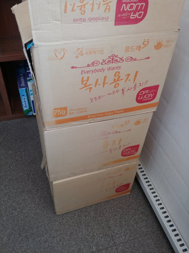 사무실에서 사용하고남은 B4용지 3박스입니다. 1박스는 뜯어만 놓구 사용은 안했고, 2박스는 박스도 안뜯었습니다 택배비만 부담하시면 보내드리겠습니다