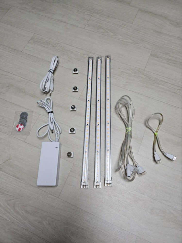 건강한 조명 바 조명이에요 1-6개 연결용 3A 어댑터 조명 3개 1m 연결선 2개 0.3m 연결선 1개 원형 자석 6개 조명 뒤에 거치하는 자석클립이 2개가 망가져서 원형 자석으로 대체해서 사용하시면 될것 같아요 (마지막 사진 참조) 우체국택배 +3000