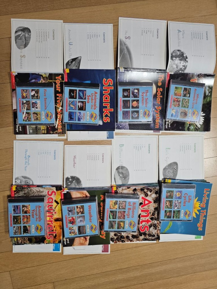 8가지 대주제가 있고 각각 가이드북, 리더스북 6권, cd 2장으로 구성되어 있습니다. (리더스북 총 48권) 잠수네 J3 정도예요. 책만봐서 cd는 비닐채 그대로인데 보관하면서 케이스 금간것들 있어요. 책은 깨끗한편이고 줄치거나 표시한것 없습니다.