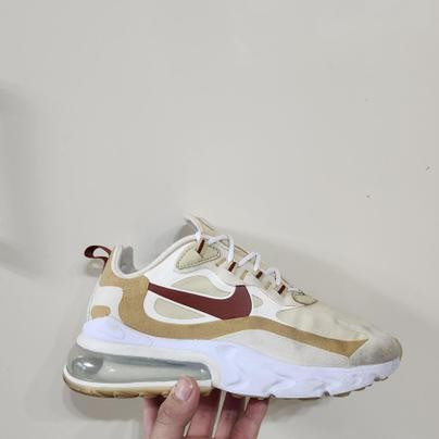 나이키 에어 맥스 270 리액트 정품 입니다! 동일 품번의 매물중에서 최저가 판매합니다 통기성 우수한 매쉬와 레더LTR 재질이며 리액트폼과 에어솔 사용으로 쿠셔닝 매우 부드럽습니다 무게가 굉장히 가벼운 초경량 런닝화입니다 페일아이보리시나몬베이지 색상입니다 심한 오염 없이 깨끗하고 착용에 불가한 하자 없이 자연스러운 생활감 존재합니다 신발 모든 부분에 나이키 로고 각인 지워짐 없습니다 양쪽 에어 모두 터짐없고 밑창도 말끔합니다 신발 빨래 해두었기에 바로 착용 가능 합니다 상태 좋은 신발 싸게 가져가세요ㅎㅎㅎ