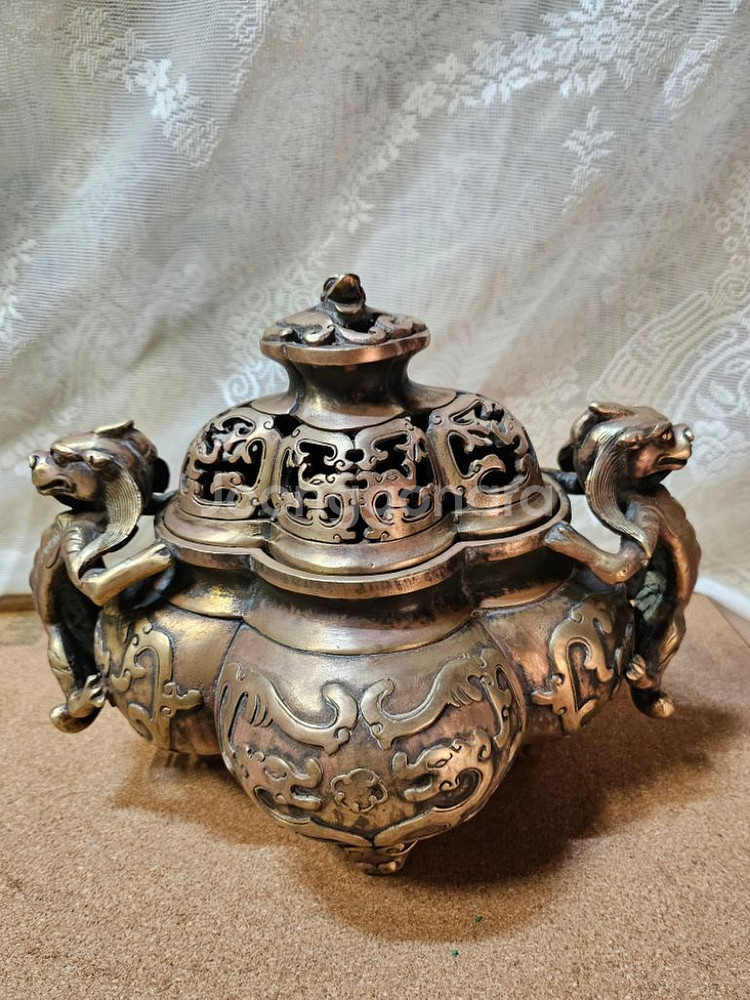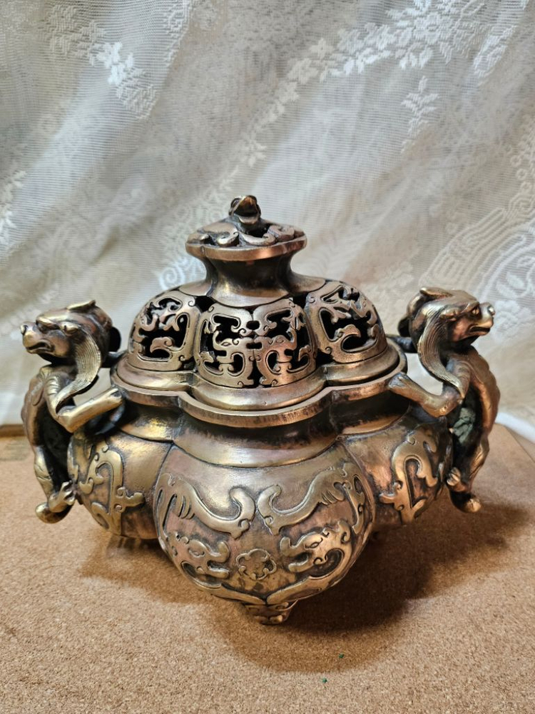 중국 황실에서 주로 사용된 최상급 황동 향로. 몸체는 사면의 원형으로, 한면에 용이 2마리. 사면에 용 8마리가 새겨져 있으며, 양옆에 용 2마리가, 뚜껑에 1마리 모두용이 11마리가 새겨진 최고급 동 향로. 바닥면에 낙관이 있습니다. 보기드문, 진기명품 황동향로 멋지게 디피하시고 소장하세요 ^^ 규격 가로 25cm 세로 20cm 폭 18cm 무게 1.9kg 재질 황동 출처 중국 /바닥면 낙관 필요하신분 먼저 가져가세요 택배착불 ^^