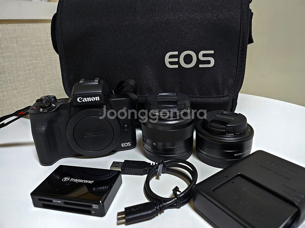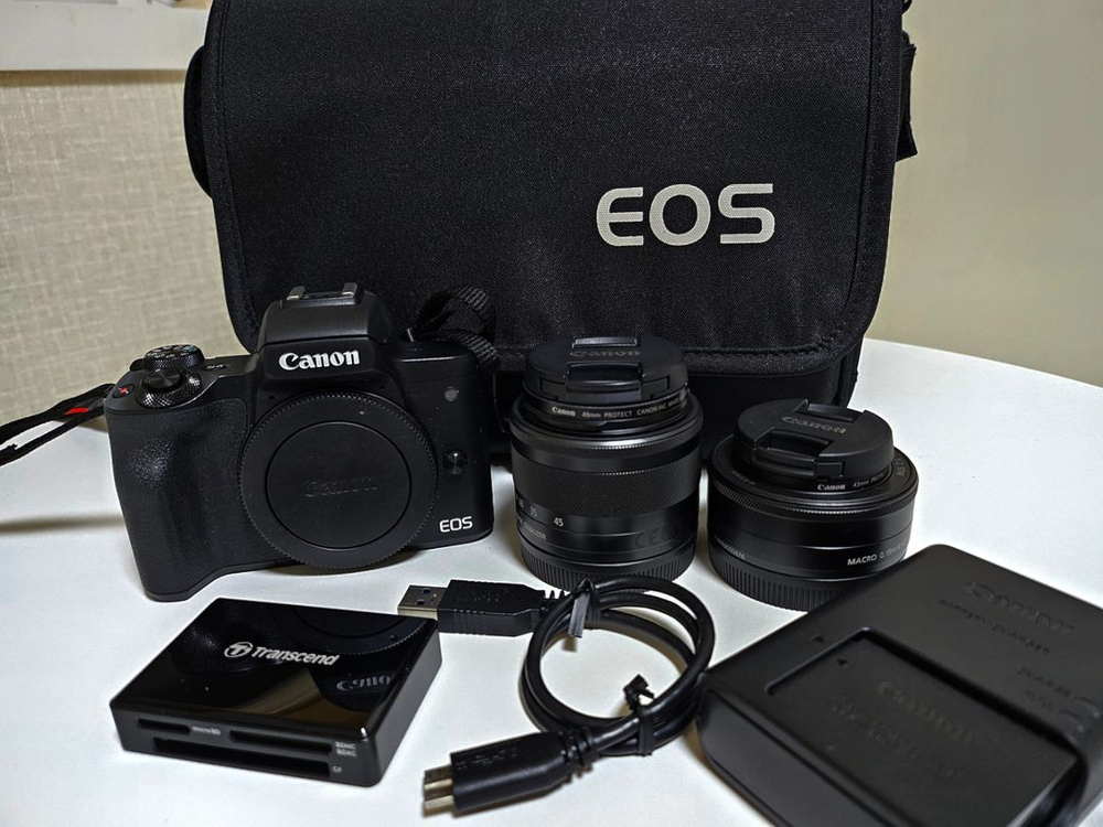 캐논 EOS M50 Mark II 본체, 15-45mm, 22mm 렌즈 1개씩 총 2개, 카메라가방+방수커버, 충전기 1개, 컴퓨터 연결 기기1개 입니다 ! 입문용으로 쓰기 좋고 화질 좋습니다 ~ 여행 다니면서 찍으려고 구매했는데 직장 때문에 시간이 없어서 별로 못 쓰고 판매합니다 ㅠㅠ 카메라 렌즈 2개 다 보호케이스 장착 되어있고, 기스 1도 없습니다 ! 15~45mm 렌즈 뚜껑에만 살짝 있어요 ! 첫 월급으로 구매했던 아이여서 관리 열심히 했습니다 😭