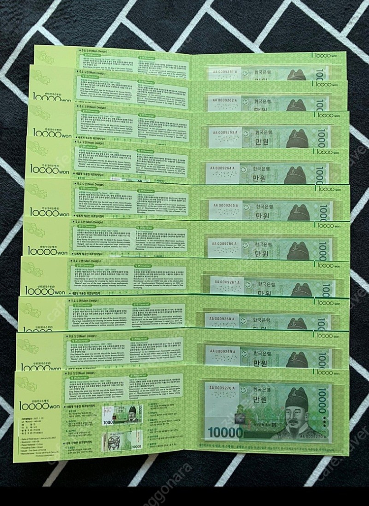 ※ 카페 상품 게시글은 자동으로 중고나라 앱/사이트에 노출합니다. 노출을 원하지 않으실 경우 고객센터로 문의 바랍니다. ※ 등록한 게시글이 회원의 신고를 받거나 이상거래로 모니터링 될 경우 중고나라 사기통합조회 DB로 수집/활용될 수 있습니다. ─────────────────── 📢 제목에 "제조사/ 브랜드 명"과 "상품명”를 넣어 작성하면, 보다 빠른 판매가 가능합니다! 📢 게시글 작성 시 배송 방법에 “직거래”와 “내 위치” 설정할 경우, 보다 빠른 판매가 가능합니다! 5차 만원 경매첩 판매합니다 경매당시 받은 물품 모두 있습니다(보증서 박스) 상태는 처음과 거의 같습니다 낱장으로는 많으나 10연번은 보기 힘든 물품이며 소장가치가 매우 높은 물품입니다. 번호는 9261-9270 입니다 010 8922 3907 연락주세요