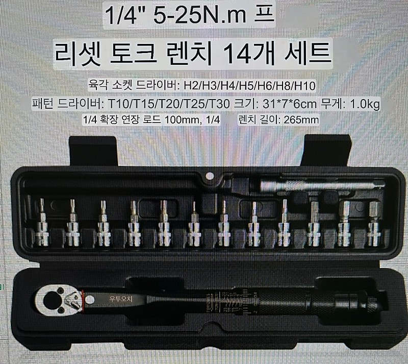 tuochi 토크렌치 세트 1/4", 5-25Nm 팝니다. 육각렌치 소켓 7개 별렌치 소켓 5개 연장로드 1개 실사용 5회 미만 윤활유로 인한 약간의 칠 벗겨짐 있으나 사용상 문제 없습니다. 직거래 인천 논현 / 그 외 택배거래 3600원 추가 (반택 1800원 추가) 연락주세요.