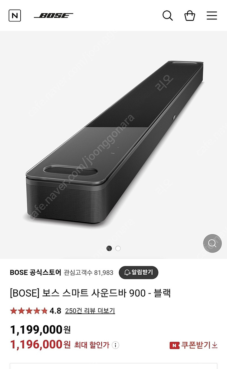 ※ 카페 상품 게시글은 자동으로 중고나라 앱/사이트에 노출합니다. 노출을 원하지 않으실 경우 고객센터로 문의 바랍니다. ※ 등록한 게시글이 회원의 신고를 받거나 이상거래로 모니터링 될 경우 중고나라 사기통합조회 DB로 수집/활용될 수 있습니다. ─────────────────── 📢 제목에 "제조사/ 브랜드 명"과 "상품명(ex. BESPOKE 4도어) ”를 넣어 작성하면, 보다 빠른 판매가 가능합니다! 📢 게시글 작성 시 배송 방법에 “직거래”와 “내 위치” 설정할 경우, 보다 빠른 판매가 가능합니다! 사운드명가 보스의 최상급 사운드바 900모델입니다. 미개봉 신품, 국내정품이라 as가능합니다. 국내정가 1,199,000원입니다. 돌비 애트모스지원, HDMI eArc optical 지원, 페이즈가이드, 트루스페이스기술적용, 공간감, 몰입감, 입체감, 음질등등 동급최고사양입니다. 심지어 돌비애트모스 미지원컨텐츠도 현장감 넘치는 7채널 사운드가 구현됩니다. 아랫등급 600,700등과는 차원이 다릅니다. 무게와 부피가 상당해서 가급적 서울 전농동 직거래합니다
