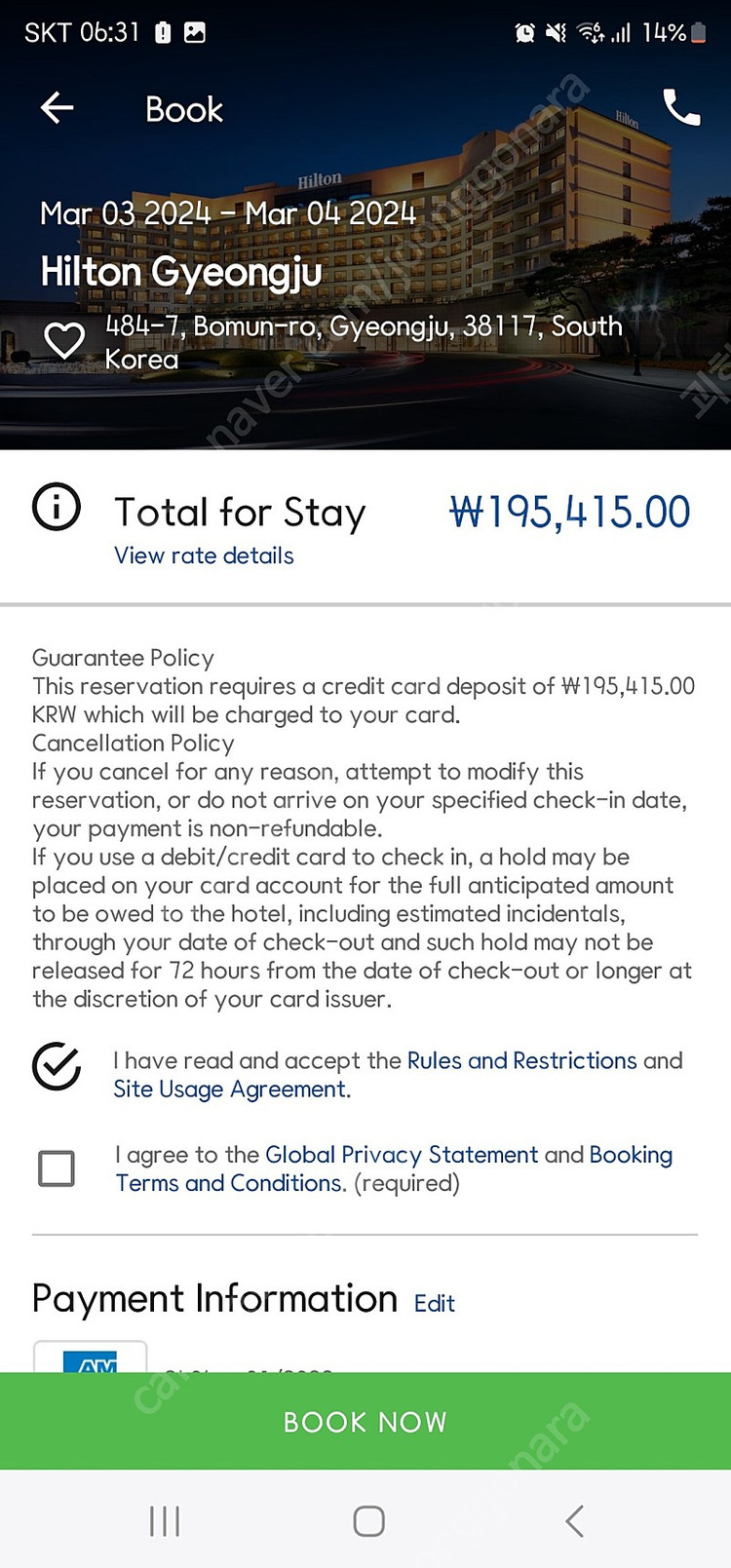 경주힐튼 3/3~3/4(일~월) 프리미엄킹룸 1박 취불로 예약했는데 배우자 임신으로 인해 못가게되어 양도 원합니다. 취불조건으로 19.5만원 정도에 예약하였으며, 양도 받으실 경우 티어 혜택은 못 받고 투숙만 가능합니다. (호텔 확인 완료) 힐튼 회원이어야 하며, 체크인 시 투숙금액(19.5만원가량) 결제하셔야 합니다. 예약 시 노쇼방지용 예약금 10만원 받고, 체크인 하시면 예약금10만원+추가 3만원, 총 13만원 보내드리겠습니다. 실투숙금액 16.6만원입니다.