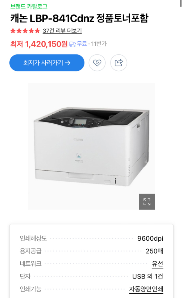 Canon LBP841Cdnz 컬러레이저프린터 팝니다. 사용했던 물건이라 여기저기 잔기스는 많습니다. 사진 보시다시피 아래쪽 모서리 철판이 조금 휘었고, 뒷쪽에 약간 깨진 부분 있습니다. 때문에 저렴하게 판매합니다. 카트리지는 검정색 하나만 있어서 나머지는 구매하셔야 할 것 같습니다. 재생 카트리지 찾아보니까 20만원 정도로 구매 가능합니다. 아래는 레이저프린터기 성능입니다. 출력 흑백 : 26ppm(분/A4) 약 7.9초(A4) 컬러 : 26ppm(분/A4) 약 9.9초(A4) 해상도 : 1200dpix 1200dpi (9600dpi상당 x600dpi) 최대용지 사이즈 : A3 급지용량 : 급지카세트 : 250매x1단 멀티트레이 : 100매 제품크기(WXOXH) : 545 X 591X 361 mm 무게 : 약 45.3Kg(토너카트리지 제외) * 진짜진짜 크고 무겁습니다. 대응Os : Win10 / Win 8.1 / Win8 / Win7 / WinVista / Win Server 2012(64bit) / Win Server 2008 R2(64bit) / Win Server 2008/ Win Server 2003 / Mac OS 10.6.8 이후. Linux, Citrix