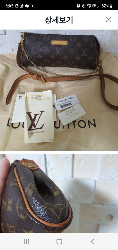 루이비통 에바클러치 정품입니다. 한쪽 수선한 상태입니다.보증서만 있습니다.가죽스트랩은 아주 길지 않아요. 편하게 사용하는데는 문제없지만 사용감은 존재하니 신중히 구매하세요. 중고특성상 정품아닐시외 교환환불 안됩니다. 배송료4000 있습니다. 찔러보기사절x