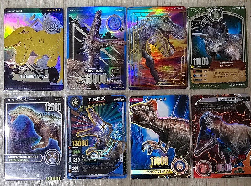 티렉스카드게임 카드 팝니다. 아래 가격 참고하세요. 교환, 환불 불가. 공룡카드 구매시 마법카드 서비스로 드릴수 있습니다. 직거래는 서울 마포구 공덕역 인근입니다. 택배, 등기 가능. 댓글 또는 1:1 채팅 주세요. 1. 13탄 5성 (황금)기가노토사우루스 - 6만원 2. 13탄 5성 딜로포사우루스 - 3만원(판매완료) 3. 13탄 5성 포이킬로사우루스 - 3만원(판매완료) 4. 13탄 5성 모노로포사우루스 - 3만원 5. 12탄 5성 스피노사우루스 - 5만원 6. 11탄 5성 티라노사우루스 - 5만원 7. 10탄 5성 트리케라톱스 - 5만원 8. 9탄 5성 아르젠티노사우루스 - 5만원(판매완료) 9. 8탄 5성 스피노사우루스 - 5만원 10. 7탄 5성 크리올로포사우루스 - 4만원 11. 6탄 5성 티라노사우루스 - 5만원 12. 13탄 4성 공룡카드 - 장당 1만원 13. 13탄 4성 마법카드 - 장당 1만원 14. 13탄 3성 공룡, 마법카드 - 장당 3천원 15. 13탄 2성 공룡, 마법카드 - 장당 2천원 16. 13탄 1성 공룡, 마법카드 - 장당 1천원 #T REXCARD #티렉스카드게임 #티렉스게임 #티렉스 #공룡카드