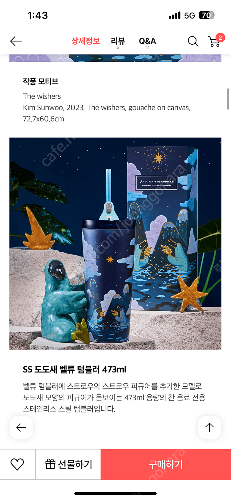 ※ 카페 상품 게시글은 자동으로 중고나라 앱/사이트에 노출합니다. 노출을 원하지 않으실 경우 고객센터로 문의 바랍니다. ※ 등록한 게시글이 회원의 신고를 받거나 이상거래로 모니터링 될 경우 중고나라 사기통합조회 DB로 수집/활용될 수 있습니다. ─────────────────── 📢 제목에 "제조사/ 브랜드 명"과 "상품명”를 넣어 작성하면, 보다 빠른 판매가 가능합니다! 📢 게시글 작성 시 배송 방법에 “직거래”와 “내 위치” 설정할 경우, 보다 빠른 판매가 가능합니다! 김선우 작가의 도도새 스타벅스 콜라보 제품입니다. 신세계몰에서 구매한 미개봉 새상품이며 선물용으로 샀다가 다른 제품을 선물해서 판매합니다. 직거래는 안암오거리 인근 주말 서초 인근 가능합니다.