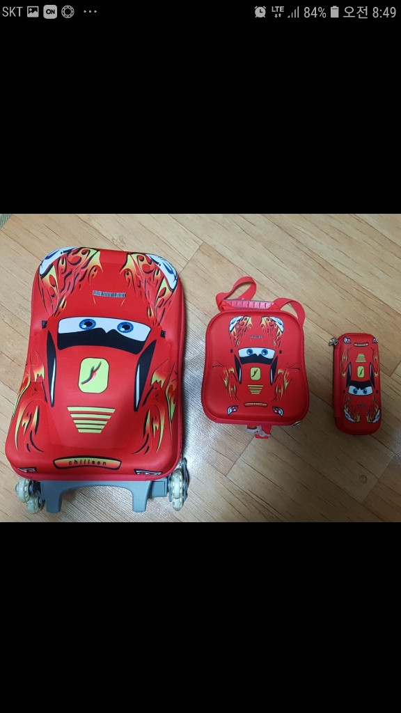 한번 사용하였어요. 여자아이라 싫어하네요 캐리어 등에 맬 수있는 보조가방 (버클이 있어서 줄 분리가능) 필통 3종세트이예요. 기스없고 얼룩없이 깨끗함