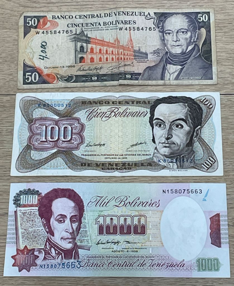 1000 볼리바르 100 볼리바르 50 볼리바르 각 1장씩 총 3장 일괄판매 가격입니다. 50 볼리바르는 많이 구겨지고 낙서도 있네요... 일반택배비는 3,500원 추가/ 알뜰택배는 CU만 가능하고 1,500원 추가입니다.
