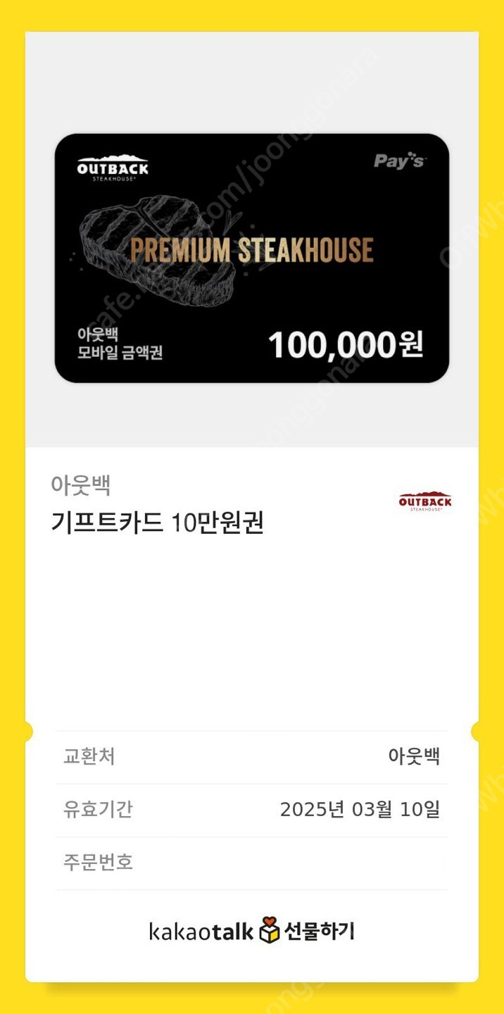 아웃백 모바일 금액권 100,000원 판매합니다. 유효기간 : 2025년 3월 10일 판매가격 : 85,000원 연락처 : 01031258072