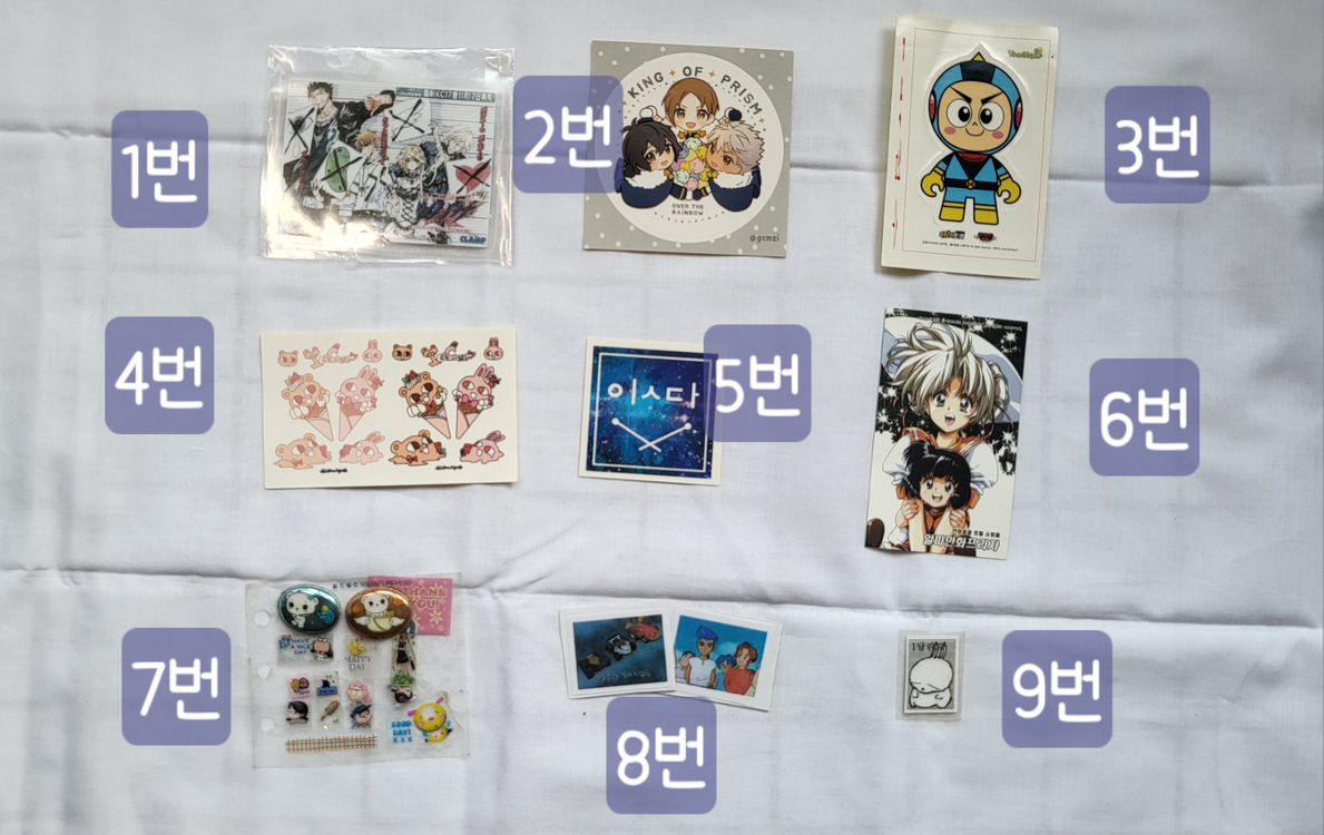 *** 필독*** * 환불 안됩니다. * 새상품 입니다. * 반값택배 2000원 추가됩니다. * 배송비 3500원 추가됩니다. * 제주 및 산간지역 6,000원 추가됩니다. * 배송시 일어나는 파손, 분실은 책임지지 않습니다. * 포장은 아주 꼼꼼하고 아낌없이 해드립니다. * 예약 × , 바로 입금 가능하신분만 연락주세요. ♡ 상품설명 1. 츠바사 크로니클 코팅텍 : 300원 2. 킹프리 스티커 : 700원 3. 미션키트맨 스티커 : 700원 4. 아이스크림 창작 스티커 : 500원 5. 별 스티커 : 200원 6. 캐릭터 카드 : 500원 7. 고전 스티커 : 500원 8. 스피드왕 번개 스티커 : 5,00원 9. 마시마로 코팅텍 : 200원