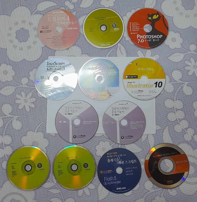 레트로들. 웹디자인 등 디자인 책자CD, 확대해서 보세요 11~2. 드림위버 4 : 개당 7.000. 영진출판사, 1회 열기만 3. 포토샵 7 : 7.000 제우미디어. 2회 사용 4. 자바스크립트 : 7.000, 정보문화사. 1회 열기만 5. 멀티미디어 : 3.000, 진영사. 새상품 6. 일러 10 : 7.000 영진출판사. 새상품 7. 컴그래픽기능사 MAC용, 윈도우용 : 개당 7.000 새상품, 영진출판사 (# 전부 구매 10.000) 8. 플래시 5. 세트2개 : 10.000 영진출판사 2회사용 9. 플래시 5 액션스크립트 : 5.000 영진출판 보관만 10. 플래시 MX 2004 : 5.000 정글. 새상품 11. 포토샵5 교재 : 3.000 삼양출판사. 중고 전부 교재용 CD라 케이스 X, 집에 있는 케이스로 전달 * 배송비 별도 GS&CU 반값택배 CD 1800, 책 2000 일반택배비도 별도 * 반품환불불가 (미작동 시 2일내 톡 한정 - 환불 및 무료반품 가능)