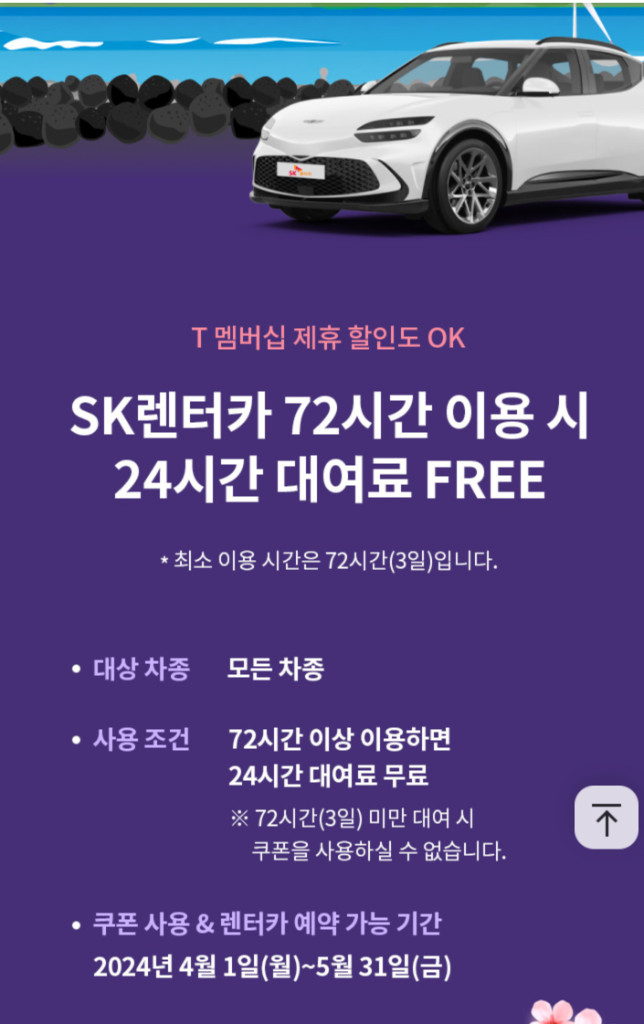 유효기간 2024.04.01 ~ 2024.05.31 ■ 유의 사항 SK렌터카 제주 무료 이용 쿠폰은 72시간(3일) 이상 대여 시에만 쓰일 수 있습니다. * 쿠폰 적용 예시 2024. 5. 21(화) 오후 3시~5.24(금) 오후 3시 일정인 경우, 총 72시간 중 48시간은 대여료를 결제하고 나머지 24시간은 무료로 이용하실 수 있습니다.단, 보험료는 따로 부담하셔야 합니다. 렌터카 예약 및 대여 기간은 2024년 4월 1일(월)~5월 31일(금)입니다. 단, 이 기간에 예약이 일찍 마감되면 이용이 어려우실 수 있습니다. 이 쿠폰은 결제 1건당 쿠폰 1장만 사용하실 수 있습니다. 이 쿠폰은 SK렌터카 회원가입 후 사용하실 수 있습니다. SK렌터카 회원 할인과 T 멤버십 제휴 할인, 24시간 무료 이용 혜택을 중복으로 받으실 수 있습니다. 이 쿠폰에 보험료는 포함되어 있지 않습니다. 이 쿠폰을 사용해 차량을 대여한 후 일찍 반납하는 경우, 24시간 무료 이용분에 대해서는 환불받으실 수 없습니다. 이 이벤트는 SK렌터카 사정에 따라 변경될 수 있습니다. ■ 문의 SK렌터카 제주지점: 064-726-6460~2 (평일/주말 오전 8시~오후 7시)