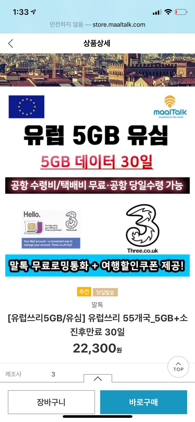 http://m.store.maaltalk.com/goods/goods_view.php?goodsNo=1000000071 자세한 유심내용은 링크 들어가서 보심됩니다 유럽여행다녀올때 친구랑 제것 2개 구매했는데 친구는 로밍을 해서 하나는 사용을 하지 않았습니다 받았을때 내용물 구성품 다 같이 드립니다~~ 올해 12월말까지 사용가능합니다^^ 2만2천원대인데 1.8에 드립니다~~ 30일사용 가능하고 5기가바이트 유럽 3유심입니다. 유럽 대부분 지역에서 사용가능합니당 자세한 사용법과 유럽국가확인은 말톡 링크에서 확인해주세요 구입문의는 010-8669-6095로 문자주세요!
