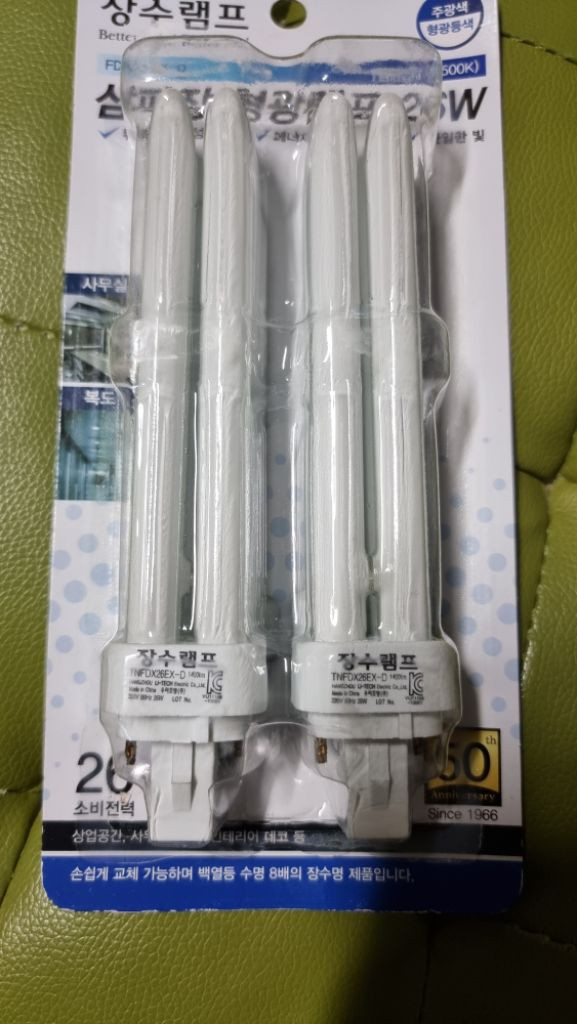 새 상품입니다. 많아서 저렴하게 등록해요. 장수램프 삼파장 형광램프 26w 2종이에요. 상세 설명은 사진 첨부해 있어요. 반품. 환불 어려워요 일반택배 3500이에요 묶음배송비 4000이에요 다른 상품과 묶음배송 으로 구매 하셔도 좋을것같아요 5만원 배송비 무료입니다 *gs 반값택배 2천원 이에요 *반값택배 3천원 부터 발송합니다 *발송전, 후, 포장상태, 송장번호 사진 *채팅 창에 올려드려요 ☆추가 수량 2개 더 있어요