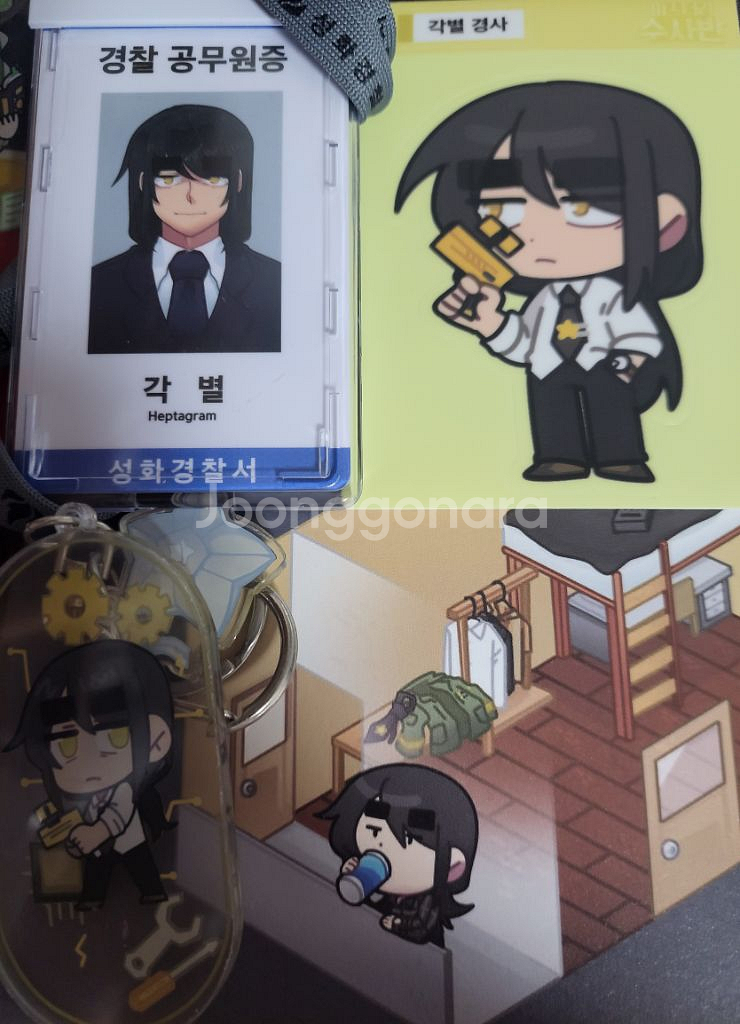 사진 구성 3.8에 양도합니다 미수반 캐릭터 씰/ 공무원증/아크릴 키링/ 엽서 구성입니다! 상점에 있는 다른 세트 추가 구매시 미수반 자수 손수건과 미수반 뱃지 덤으로 드립니다! 끼택/반택 : 0.2 미수반 키링 필름 붙어있으며, 지류 굿즈 상태 깔끔합니다! 공무원증은 왼쪽 위 케이스에 공장하자 있는 것 빼고는 깔끔해요!