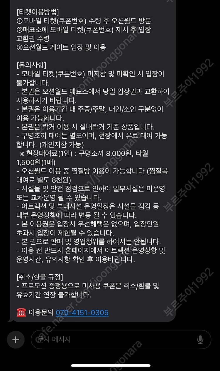 ※ 카페 상품 게시글은 자동으로 중고나라 앱/사이트에 노출합니다. 노출을 원하지 않으실 경우 고객센터로 문의 바랍니다. ※ 등록한 게시글이 회원의 신고를 받거나 이상거래로 모니터링 될 경우 중고나라 사기통합조회 DB로 수집/활용될 수 있습니다. ─────────────────── 📢 제목에 "제조사/ 브랜드 명"과 "티켓명(ex. 스타벅스 아메리카노 Tall) ”을 넣어 작성하면, 보다 빠른 판매가 가능합니다! 📢 게시글 작성 시 배송 방법에 “직거래”와 “내 위치” 설정할 경우, 보다 빠른 판매가 가능합니다! 오션월드 입장권 2장 일괄로 팝니다! 연락주세요!