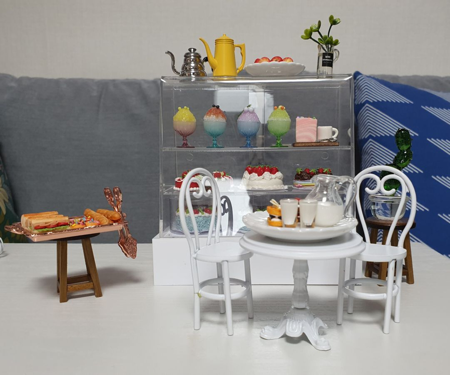 명확하게 밝히지 않는 분들 전부 차단합니다. 글에 일반적인 설명은 다 써두었으나 글을 좀 읽어보시고 톡 부탁드립니다. 1. 케잌 진열장-전체 아크릴. 뒷편 왼쪽만 열리고 오른쪽문은 고정. 가로 13cm/높이 13cm/폭 6.5cm-25,300원 2. 실버드립주전자-금속 높이 2cm/가로 4cm-5100원 3.노랑드립주전자-금속 높이 3cm/가로 3.5cm-5100원 (주전자 뚜껑 다 열립니다.) 4. 도자기접시 중-지름 4cm-1650원 5. 사과 8개-4050원 6. 유리식물-플라스틱/레진소재-2450원 7. 빙수-플라스틱/레진 높이 5.5cm-개별가 5,100원씩 8. 쉬폰케잌트레이-고정된 상태. 케잌부분은 스폰지소재/트레이는 나무/가로 약 3cm 높이 2-6100원 9. 작은 케잌-레진-2050원 10. 큰케잌-레진-5100원 11.케이스에 든 케잌-6100원 12. 원형스툴-나무/높이 4cm.가로 3cm-6100원 13.동쟁반과집게-금속/가로 7cm 세로4.5cm-5100원 14.샌드위치-가로 1.6cm 높이 0.9cm-개당 1050원 15. 도넛-개당 550원 16. 쿠키-개당 650원 17. 바게뜨-개당 1050원 18. 유리선인장-높이 약 5.8cm-10150원 19.화이트테이블/의자세트-금속/테이블높이 5cm.지름 5.6cm. 의자높이 7.8cm 측면 2.5cm 세트구성으로 20250원 (다리위치등 변경하려고 힘주면 다리 부분이 약해서 부러집니다. 되도록이면 변형가지 마세요) 20. 우유서버와 우유잔세트-유리.레진/우유서버/높이 약 2.5cm/ 잔 높이 약 1.2cm-6천원(※※같은 모양의 오렌지쥬스세트도 있습니다) 21. 와플-개당 4100원 반값택배비 1900~2300원 일반택배시 수도권 3400원 ~ 타지역 3900원~ 우체국접수 4천원 작은 소품류의 경우 준등기 가능 1800원 (준등기의 경우 우체국에서 분실책임 없다고 합니다