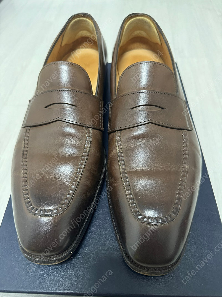 랄프로렌 퍼플라벨의 다크브라운 페니로퍼를 판매합니다. 가지아노걸링 메이드 특징인 피들백 웨이스트가 적용되어 있으며 앞코는 고급스러운 그라데이션으로 염색되었습니다. 라스트는 가지아노걸링의 kn14 입니다. 구두 상태는 사진과 같이 9.5/10 정도 수준으로 매우 좋은 컨디션이며, 제겐 사이즈가 한치수 커서 구매 후 거의 신지를 못했네요 사이즈 US9.5, UK8.5 저는 보통 UK7.5를 신는데 UK8 신으시는 분에게 추천드립니다. 01O-637구-946일