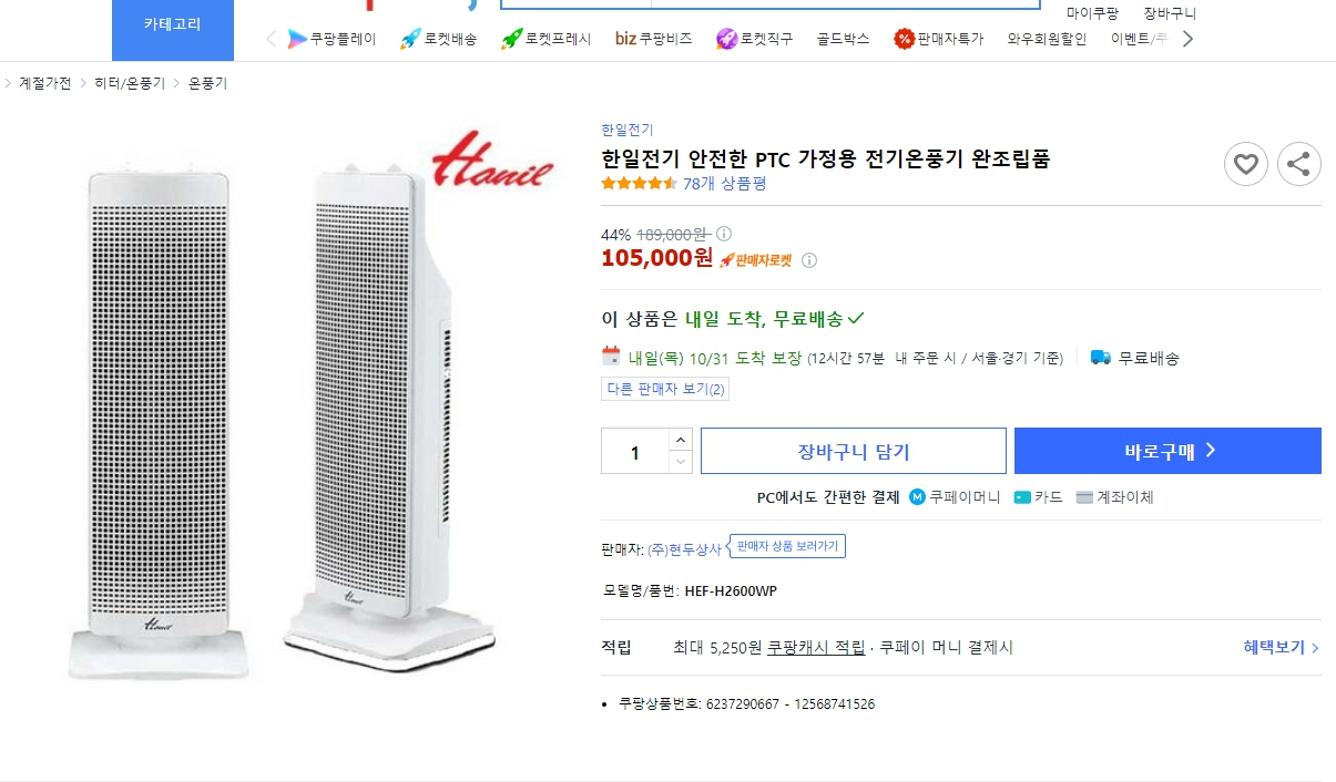 쿠팡 105,000원 새상품 미개봉 한일전기