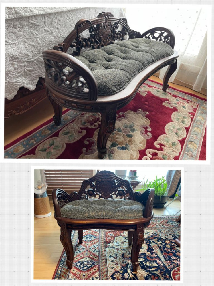 장식용으로만 놓아두고 있던 의자들입니다. 세트로 2개 함께 구매가격입니다. 긴 의자 대략적 사이즈입니다(곡선이라 부정확) 가로 155cm 세로 45cm 높이 68cm(등받이까지) 높이 40~45cm(앉는 부분까지) 작은 의자를 가로 길이가 긴의자의 반 정도 됩니다. 조각이 매우 섬세하고 고급스럽습니다 천 방석부분도 꺼짐없이 푹신하고 상태 좋습니다 경기도 용인시 포곡읍으로 오셔서 직접 들고 이동/운반 가능하신 분만 가능합니다. (엘레베이터 사용가능)