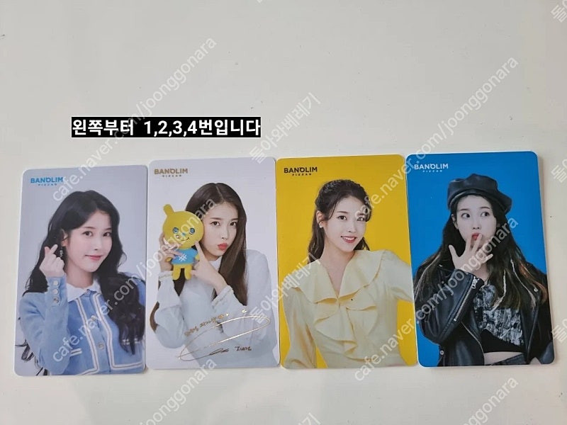 ※ 카페 상품 게시글은 자동으로 중고나라 앱/사이트에 노출합니다. 노출을 원하지 않으실 경우 고객센터로 문의 바랍니다. ※ 등록한 게시글이 회원의 신고를 받거나 이상거래로 모니터링 될 경우 중고나라 사기통합조회 DB로 수집/활용될 수 있습니다. ─────────────────── 아이유 반올림 포토카드 !!! 🩷왼쪽부터 1,2(흰색) 번은 한정판으로 장당 3,000원 💛3,4(노랑,파랑)번은 장당 2,000원💛 택배거래만 하구요, 택배비는 3,000원 별도입니다. GS반값택배시 택배비 2,000원입니다. 4장 일괄구매시 9,000원입니다. 💜보내드릴땐 비닐안뜯은 새걸로 보내드립니다.💜 대량구매 가능!!!